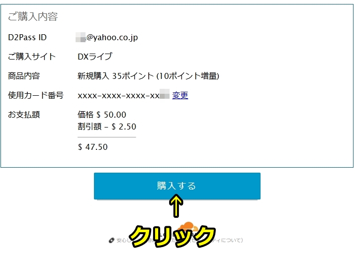 次は確認画面が出ますので「商品内容 35ポイント(10ポイント増量)」「お支払額 $50.00 割引額 -$2.50」と表示されてポイント購入5%割引クーポンが正常に適用されているのを確認したら「購入する」をクリックしましょう。