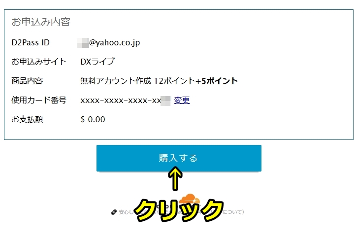 次は確認画面が出ますので「無料アカウント作成 12ポイント+5ポイント」と表示されて無料お試しポイント増加クーポンが正常に適用されているのを確認したら「購入する」をクリックしてください。