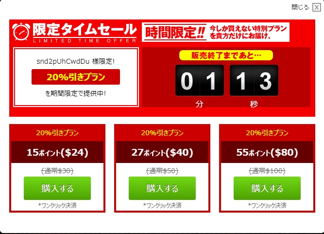 DXLIVEでにログインすると上の画像のように、不定期でタイムセールのポップアップが出てきて、ポイントがお得な割引価格で購入できます。